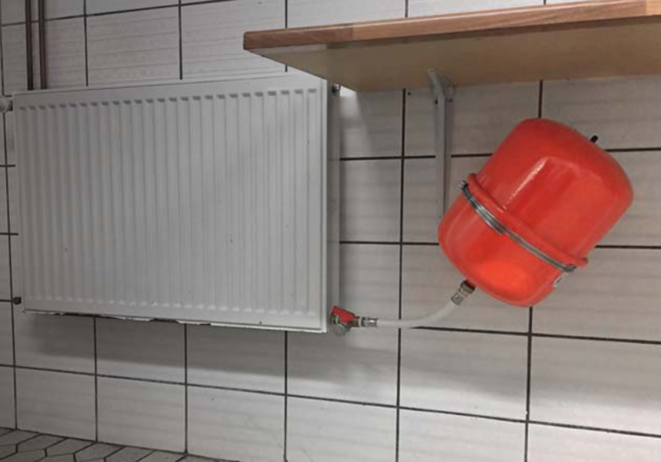 Klar, üblicherweise ist das Membranausdehnungsgefäß einer Heizungsanlage direkt am Kessel positioniert. Hier hat man unkonventionelle, neue Wege beschritten. Egal ob es nun wirklich nicht anders ging, hier hat es jedenfalls Seltenheitswert!