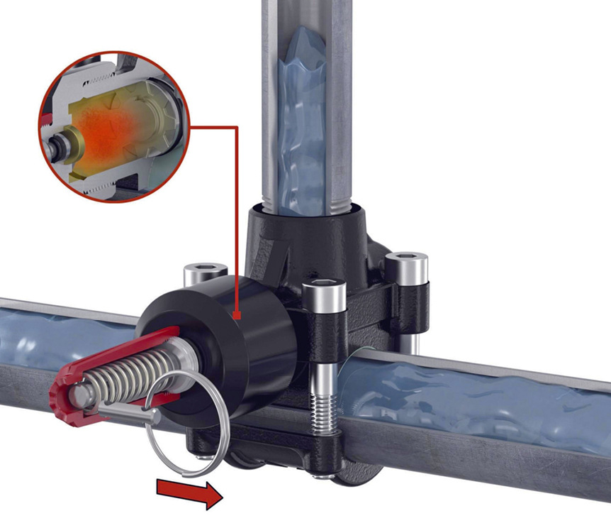In wenigen einfachen Schritten kann mit diesem Set ein Abzweig erstellt werden: Zunächst wird der T-Plus mit vier Schrauben am Rohr befestigt. In einem nächsten Schritt sind die Schrauben kreuzweise festzuziehen. Danach kann der Installateur die gewünschte Abzweigung bereits anschließen. Ist alles vorbereitet, ist der Trigger so zu drehen und zu positionieren, dass er komfortabel gezogen werden kann. Es folgt das Durchschneiden des Plombendrahts mit dem abschließenden Ziehen des Sicherungsstifts, worauf sich die Treibladung entzündet. Der freigesetzte Druck wirkt auf den Schneidkolben und treibt ihn vorwärts, sodass das Rohr im benötigten Bereich aufgeschnitten wird. Der Prozess geschieht absolut präzise in der gewählten Ausschnittgröße. Damit ist die Abzweigung fertig und normgerecht installiert. Das abgeschnittene Rohrteil verbleibt dabei sicher im T-Plus und kann nicht in die Leitung gelangen.