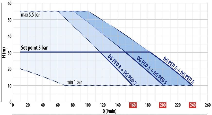 Mit dem Typ „DG PED“, bietet Pedrolo eine mehrstufige selbstansaugende Betriebswasserpumpe an. Die Pumpe wird mit integriertem Frequenzumrichter, Druckausdehnungsgefäß und Rückschlagventil geliefert. Sie ist insbesondere für die Regen- und Betriebswassernutzung geeignet. Durch das selbsterklärende Bedienfeld lässt sie sich leicht auf den erforderlichen Druck einstellen. Die Frequenzsteuerung in Verbindung mit elektronischen Zusatzfunktionen, z. B. für optimalen Ein- und Ausschaltzeitpunkt, sorgen für gleichmäßige Druckverhältnisse an den Verbrauchsstellen und dauerhaft energiesparenden Betrieb.