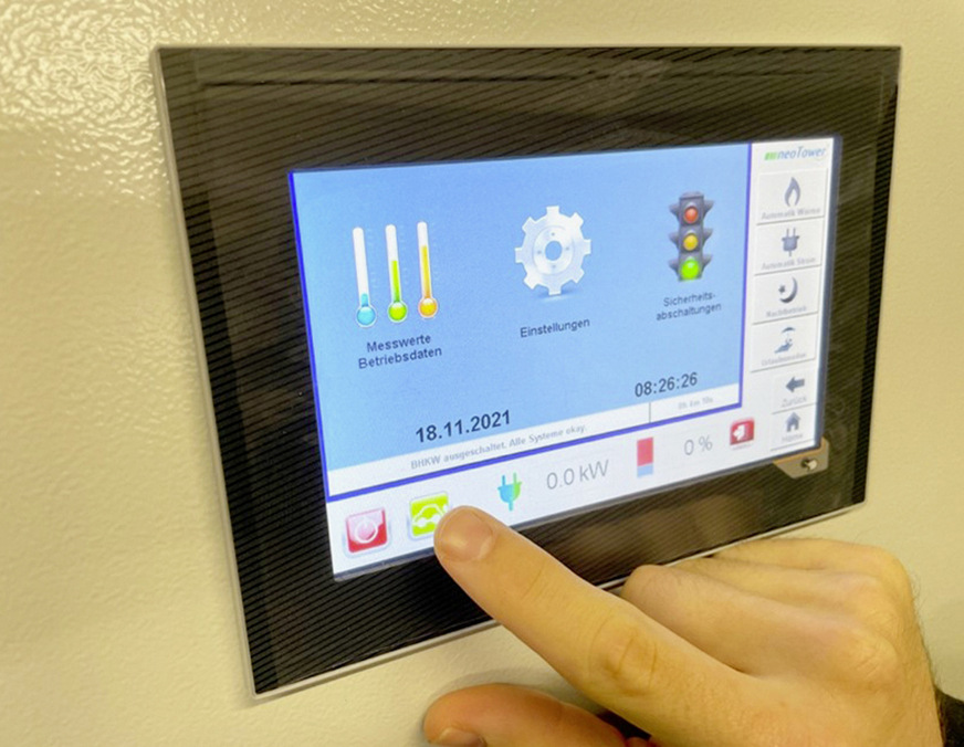 Genau genommen handelt es sich dabei um eine standardmäßig vorhandene Funktion auf dem Bedienfeld der BHKW-Steuerung. Sie signalisiert auf Knopfdruck den Vorrang für eine sofortige Stromerzeugung, auch wenn der Pufferspeicher im Normalbetrieb gerade keine Wärmeanforderung meldet. Die E-Auto-Ladefunktion bleibt maximal zwei Stunden aktiviert.