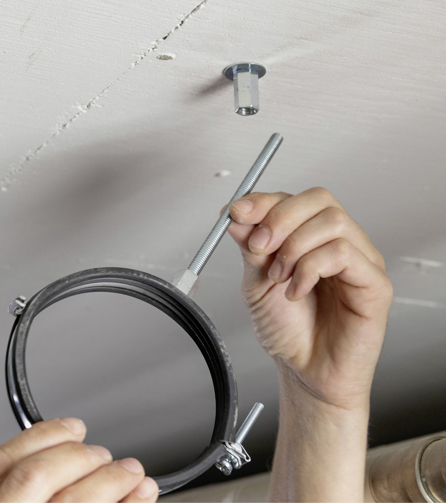 Die Variante FK ist eine Option, um Deckenabhänger, Kabelkanäle und schmale Profile zu befestigen. Die Variante IM mit Innengewindeanschluss ist geeignet für die Befestigung abgehängter Rohrleitungen, die Variante AG nimmt mit Anschlussgewinde Rohrschellen auf.