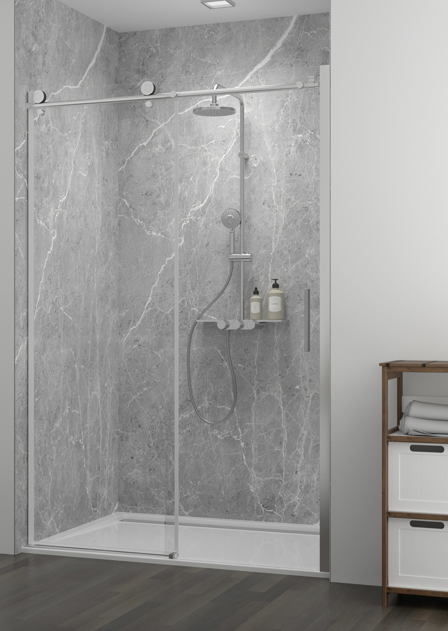 Die seidenmatte Oberfläche wirkt durch mehrere Lackschichten inklusive Zwischenschliff sehr edel. So lässt sich eine ausgesprochen hochwertige Wandgestaltung ohne (neue) Fliesen realisieren. Insgesamt 16 Seidenmatt-Dekore in zwei bzw. drei Größen stellt Duschwelten dafür zur Verfügung. Ein zusätzlicher Pluspunkt: Fingerabdrücke sind auf diesen Elementen nicht sichtbar. In der Kategorie Beton-Stein-Marmor sind Schiefer grau und Metall Rost als Dekor hinzu gekommen, die neue Putz-Optik bietet 6 Varianten.