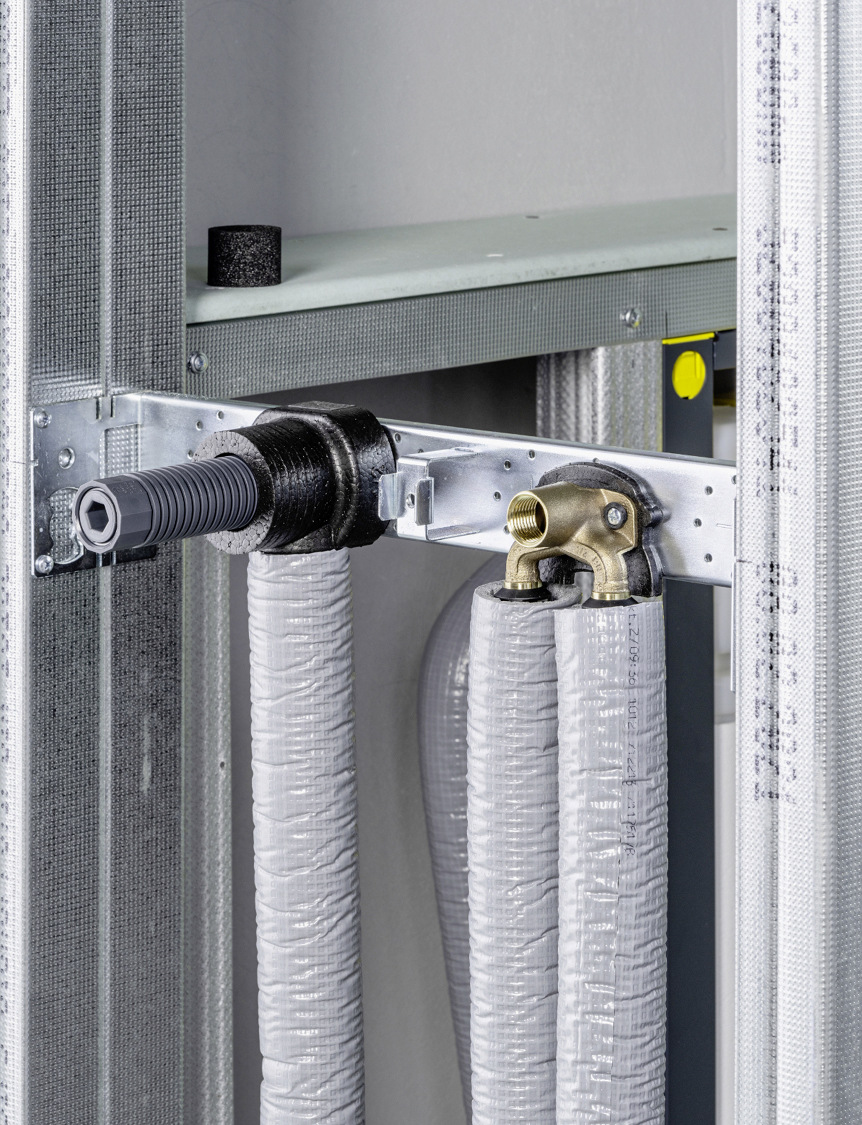 Nach Fertigstellung des Trockenbaus kann die Wandscheibenabdichtung über eine Dichtmanschette dann in die Verbundabdichtung integriert werden. Das passgenaue Ablängen erfolgt schließlich nach Fertigstellung des Fliesenspiegels.