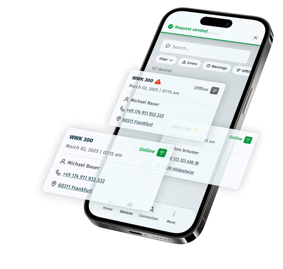 Um sicherheitsrelevante Funktionen nutzen zu können, ist eine Authentifizierung mit Kundennummer erforderlich. Diese Verifizierung gewährleistet, dass die App ausschließlich von qualifiziertem Fachpersonal genutzt wird und die Integrität der Geräte sichergestellt bleibt.