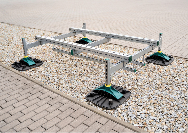 Eine der zentralen Erweiterungen ist das Montagesystem zur Dachaufständerung, das durch verstellbare Standfüße und eine integrierte Antivibrationsmatte überzeugt. Die Konstruktion wird nicht mit dem Gebäude verschraubt, wodurch die Dachmembran geschützt und das Risiko von Undichtigkeiten minimiert wird. Die Standfüße sind bis zu einem Neigungswinkel von 7° verstellbar und ermöglichen eine optimierte Lastverteilung. Ein unter dem Rahmen angebrachtes Ballastierungssystem sorgt für Stabilität bei hohen Windlasten und wird mit handelsüblichen Gehwegplatten befüllt.