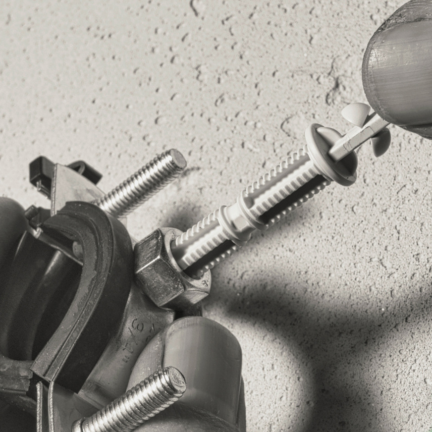 Das Prinzip der Befestigung der Rohrschelle per Gewinde-Dübel ist so mühelos wie zeiteffizient, denn sie machen den Einsatz von Dübeln und Schrauben überflüssig. Der Grund: Beim SGD Gewinde-Dübel ist das Dübelelement bereits fest integriert. Die exzenterförmigen Spreizkörper verhindern zuverlässig, dass der SGD aus dem Bohrloch rutschen kann und gewährleisten eine maximale Belastung von bis zu 260 N und untergrundabhängige Auszugswerte bis 65 kg. Kurzum: Der SGD hat an einem Ende ein leistungsstarkes Dübelelement, auf der anderen Seite befinden sich mehrere Gewindeelemente, die nach Bedarf kürzbar sind.