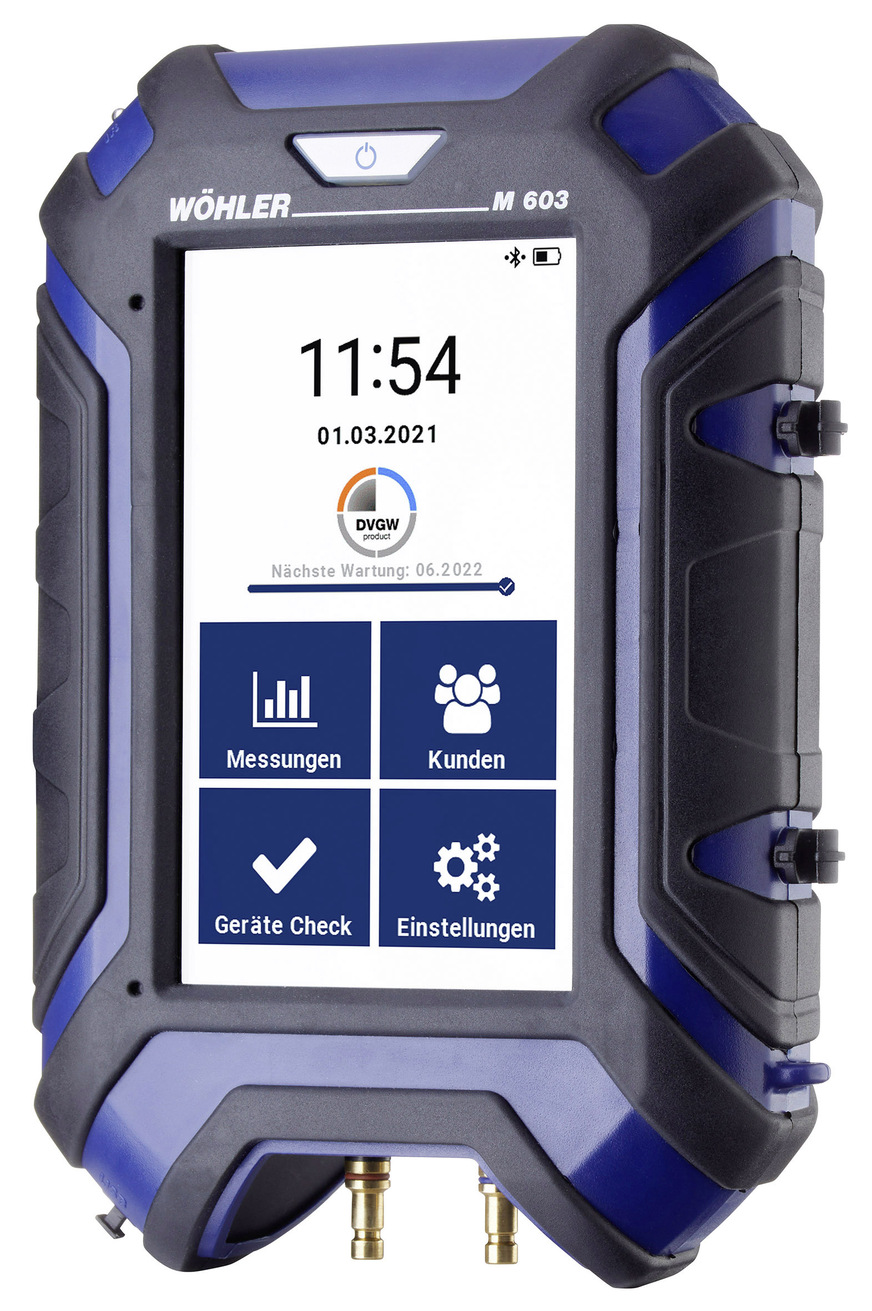 Mit dem Wöhler M 603 Druckmessgerät lassen sich alle Messaufgaben an Gas-, Trinkwasser- und Abwasserleitungen erledigen. Zu den Anwendungsbereichen zählen die Messungen an Gasleitungen und Gaskomponenten nach TRGI 2018, Messungen an Trinkwasserleitungen nach DIN EN 806 sowie an Abwasserleitungen nach DIN EN 1610. Als weitere Menüpunkte stehen die Möglichkeit zur Ortung von metallischen Leitungen zur Verfügung sowie eine Loggerfunktion zur Langzeitüberwachung von Druck, Temperatur und Feuchtedaten. Das Wöhler M 603 ist DVGW-zertifiziert nach G5952 und TÜV geprüft, so dass die Gas-Messung mit dem Gerät den Ansprüchen aller Auftraggeber, auch der Versorger, genügt.