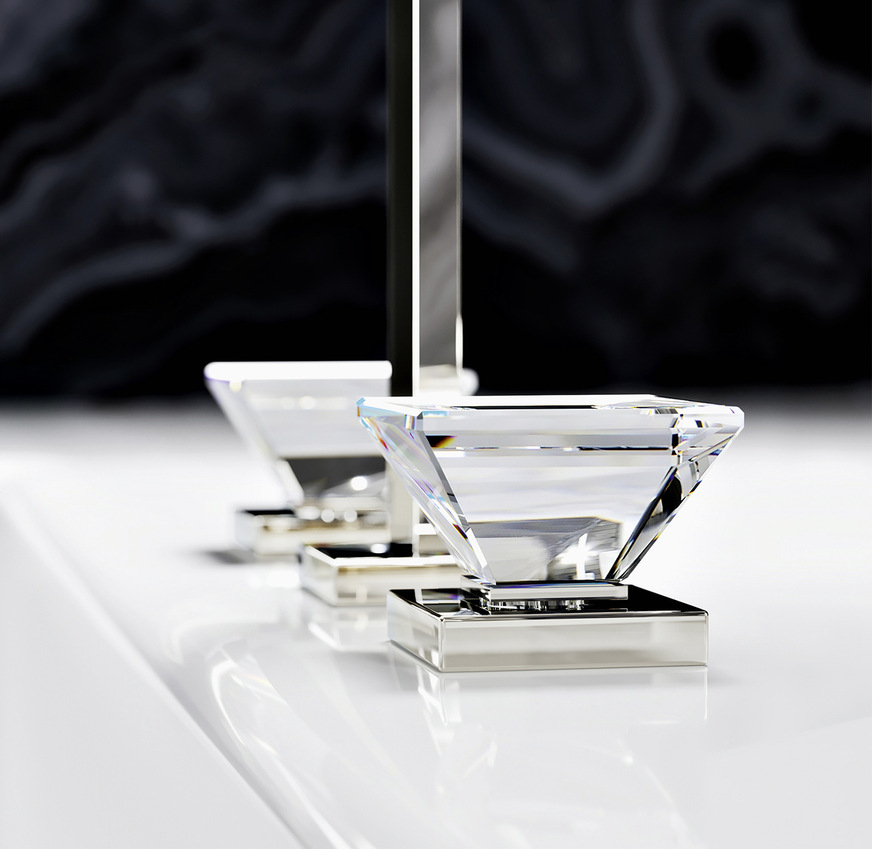 Ihre dekorative Wirkung entfalten die Kristallgriffe im spannungsreichen Zusammenspiel mit dem puristisch-minimalistischen Armaturendesign. Sie bewahren den cleanen Look der Armatur und fügen gleichzeitig ein Element üppigen Schmucks hinzu, das nahezu jedes Badezimmer in die Höhe von wahrem und sinnlichen Luxus hebt.