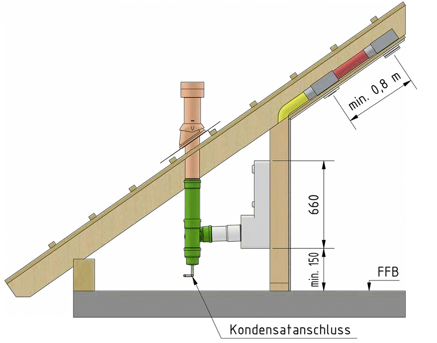 Steht kein ausreichender Platz an einer Giebelwand zur Verfügung, eignet sich auch der Kniestock, auch Drempel genannt, unter der Dachschräge zum Einbau des Lüftungsgerätes. Voraussetzung ist eine Einbauhöhe von ca. 85 cm. Das Gerät kann sowohl auf der Wand als auch platzsparend in der Wand installiert werden.