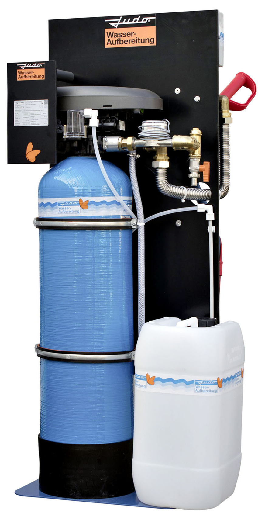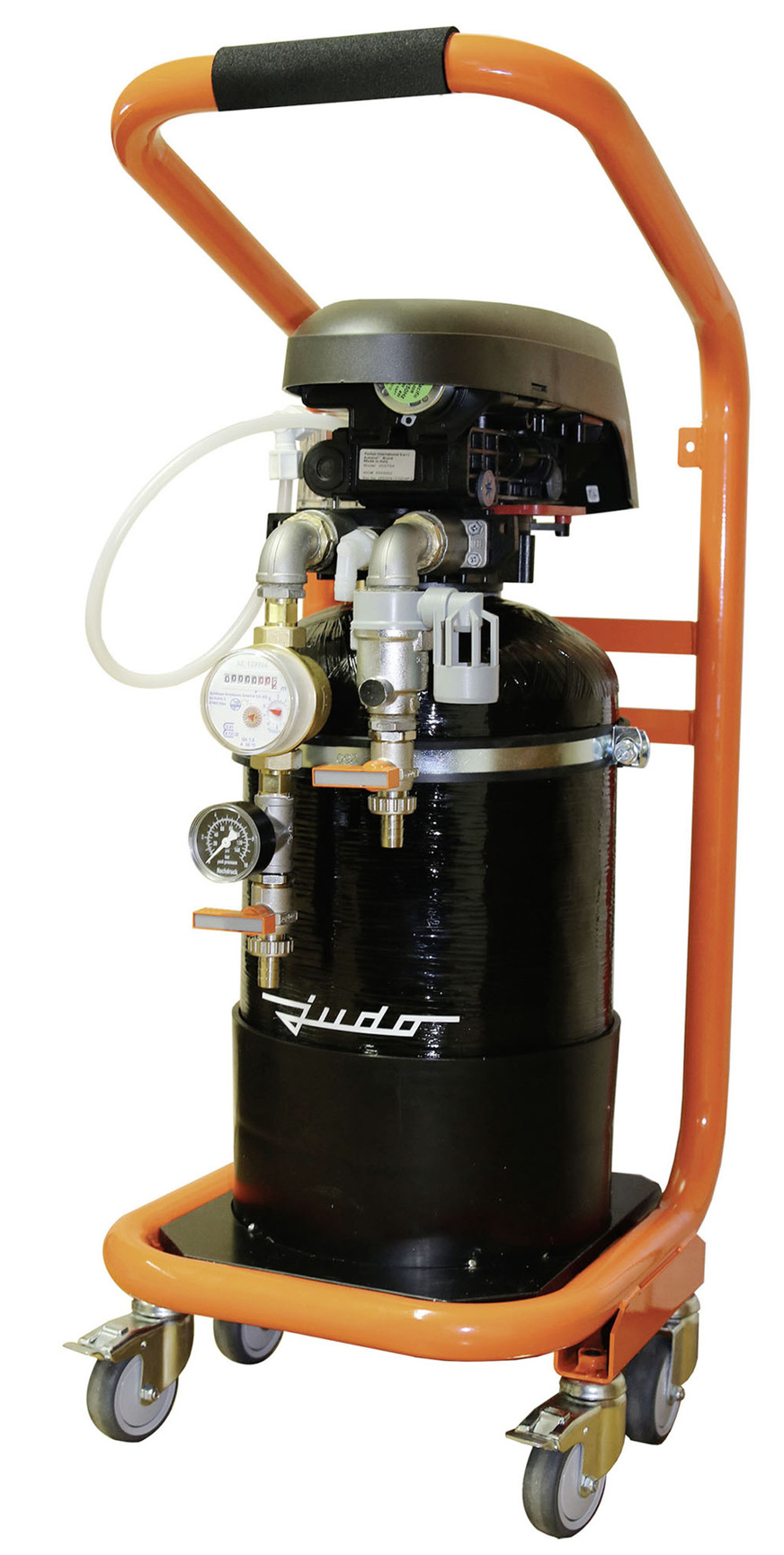Zum Judo Produktprogramm zählt unter anderem die Anlage JMHB, die für eine normgerechte Heizwasserqualität mit enthärtetem Wasser sorgt. Das Besondere: Durch ihre kompakten Maße, ein reduziertes Gewicht und die Rollen ist die Anlage für den mobilen Einsatz geeignet. Dank Regeneration mit Fertigsole, die vor Ort aus Feinsalz hergestellt wird, ist sie sofort einsatzbereit und eignet sich hervorragend auch für große Systeme. Die mobile Heizungsbefüllanlage besteht aus einem Wechselfilter 25 µm, Rohrtrenner Typ BA sowie der Einzel-Enthärtungsanlage. Sie verfügt zudem über eine automatische Verschneidearmatur und wird komplett auf einer Sackkarre betriebsfertig vormontiert.