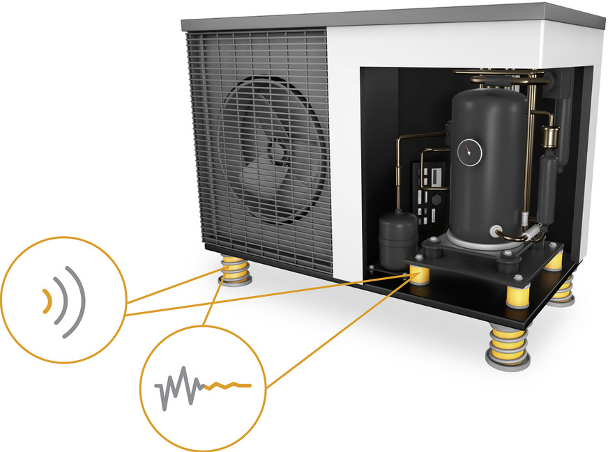 Werden Vibrationen mit einem optimal ausgelegten Schwingungsschutz minimiert, wirkt sich dies auch auf den primären Luftschall von Geräten aus. Bei HLK-Equipment mit eingebautem Kompressor spielt dieser eine entscheidende Rolle als Quelle von Vibrationen. Neueste Inverter-Technologien steigern zwar die Effizienz von Geräten, stellen aber hohe Anforderungen an das Thema Schallreduzierung. Variable Dreh- und Erregerfrequenzen führen insbesondere im Teillastbereich zu einem unangenehmen, tieffrequenten ‚Brummen‘. Mit einer direkten, elastischen Lagerung des Kompressors wird die Bildung von Körperschall verhindert, die Anregung von Gehäuseteilen minimiert und so der primäre Luftschall reduziert. Neueste Messungen zeigen, dass der Schallpegel insbesondere bei niedrigen Drehzahlen des Kompressors um bis zu 8 dB(A) gesenkt wird.
