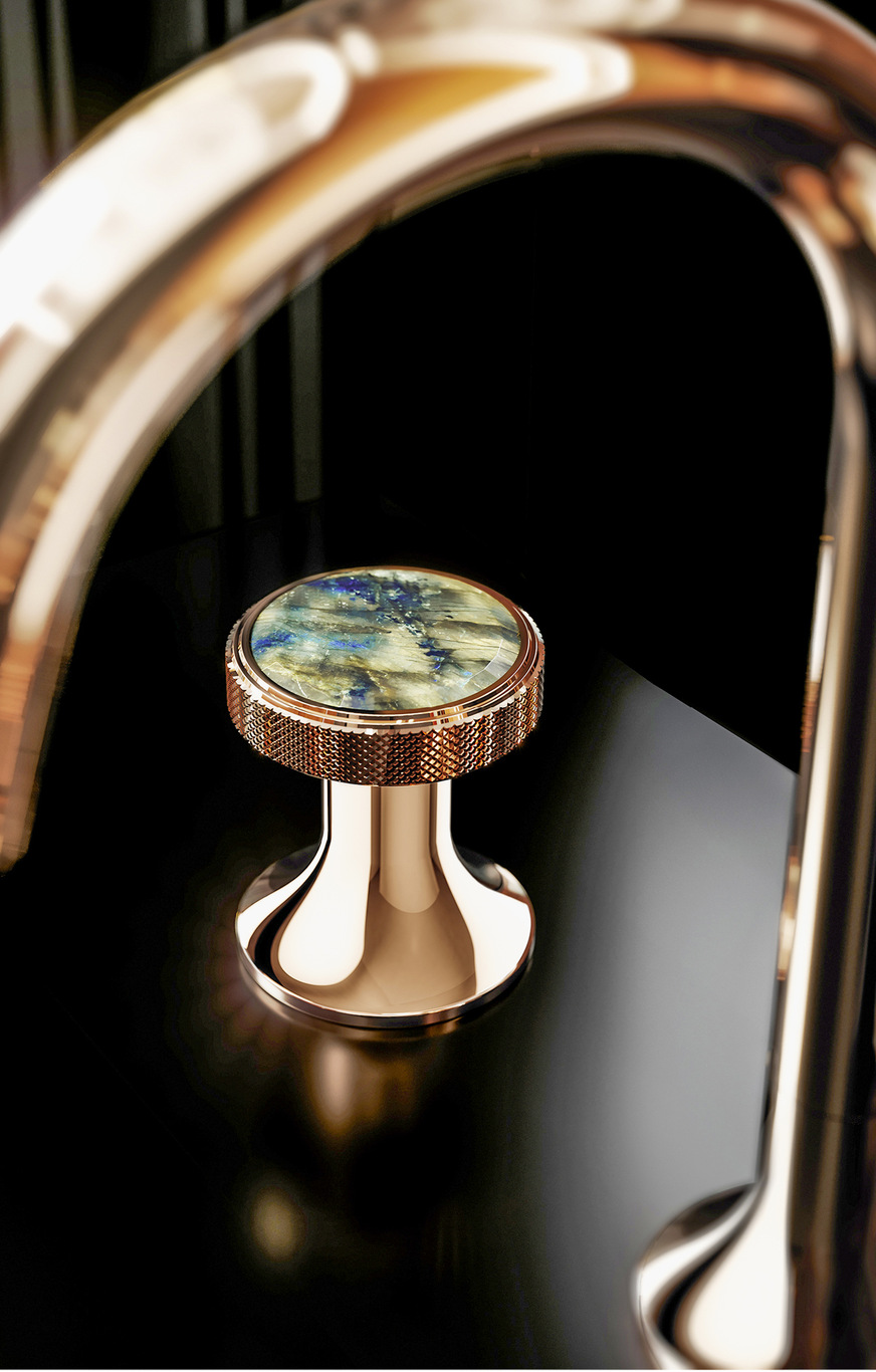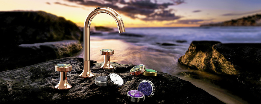 Das neue Design verwandelt die Kollektion und ihre Produktelemente in ein einziges Schmuckstück: Edle Natursteine und farbenprächtige Edelsteine zieren die Griffe der „Valencia“-Badarmaturen. Zur Auswahl stehen Labradorit, Malachit, schwarzer Marmor, violetter Amethyst, blauer Aventurin und weißer Türkis.
