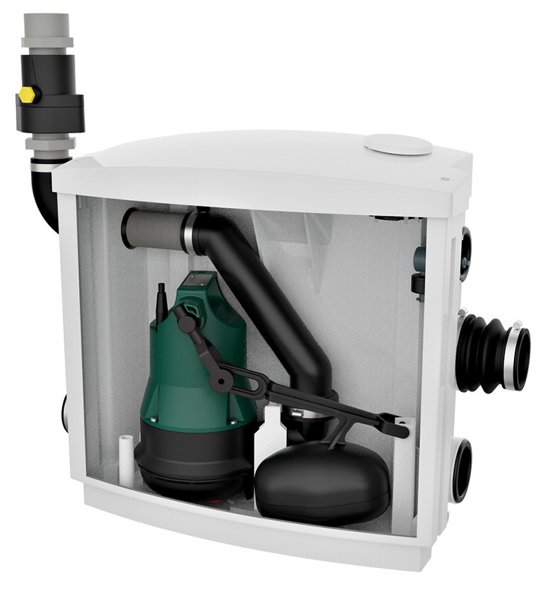 Durch die geringe Behältertiefe passt das Gerät in handelsübliche Vorwandsysteme und kann alternativ direkt an die zu entwässernden Anlagen angeschlossen werden. Die steckerfertige Lieferung ermöglicht den Anschluss an eine Schuko-Steckdose. Sobald Abwasser zufließt, arbeitet die Hebeanlage vollautomatisch.