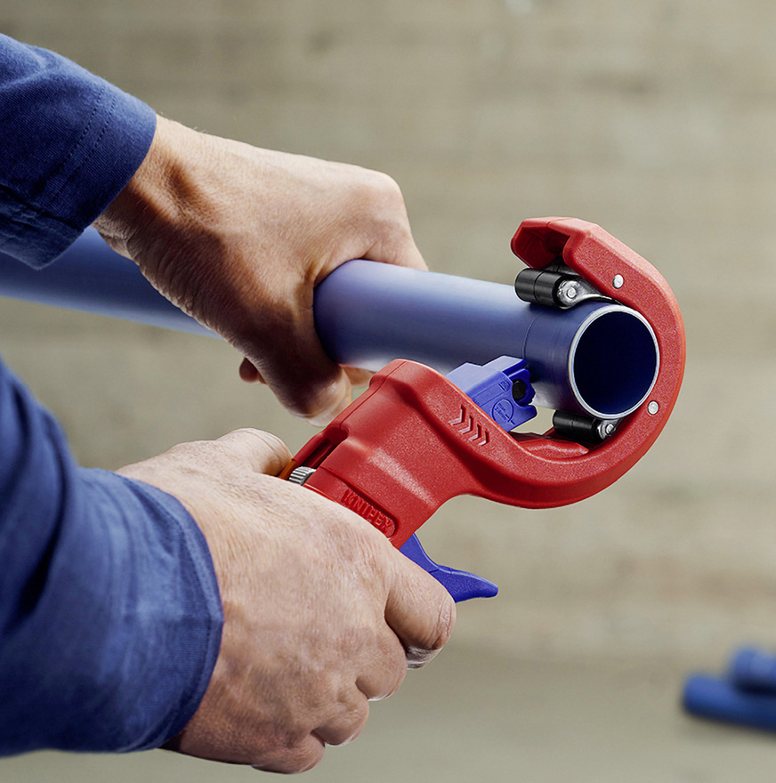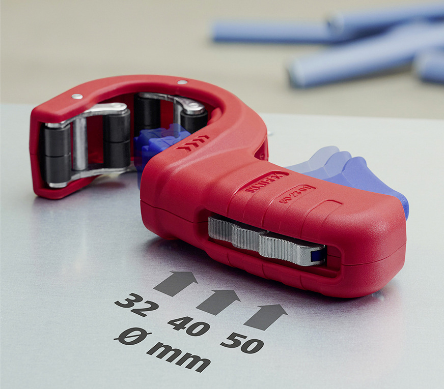 Mit dem neuen Rohrabschneider für Kunststoffrohre Knipex DP50 präsentiert der Wuppertaler Werkzeughersteller einen Sanitär-Helfer, der gleich zwei Funktionen in sich vereint. Hausabwasserrohre (HT-Rohre) in den gängigen Durchmessern 32, 40 und 50 mm lassen sich in nur einem Arbeitsgang leicht und präzise schneiden und anfasen. Weder anschließendes Entgraten noch ein Nachstellen während des Schnitts sind nötig. Verstopfungen oder Schäden an Dichtungen durch unsachgemäße Entgratung werden zuverlässig vermieden. Kunststoffrohre mit einem Durchmesser von 32, 40 oder 50 Millimeter und Wandstärken bis 2,4 Millimeter werden leicht, sauber und glatt geschnitten, es ist kein Nachstellen oder Entgraten nötig. Eine werkzeuglos wechselbare Wendeklinge aus hochwertigem Kugellagerstahl sorgt für den glatten Schnitt.