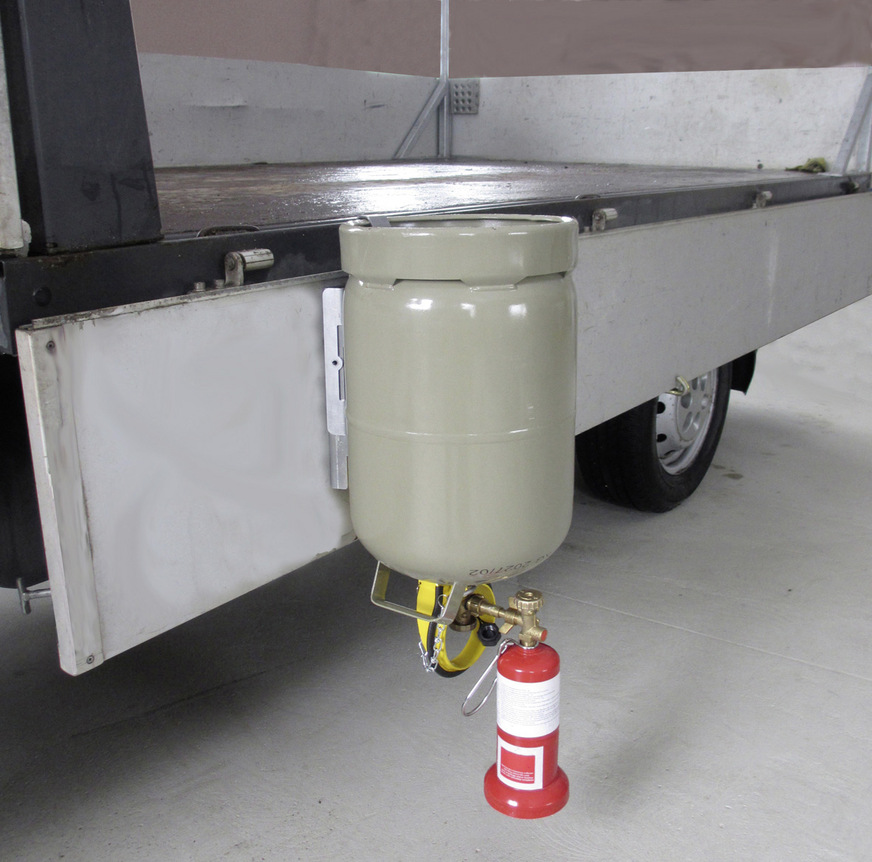 Je nach Arbeitsanwendung sind leichte Montageflaschen schnell geleert. Mit dem patentierten 2 in 1-System T.RAX sorgt Perkeo nun für eine effiziente und sichere Nachfüllmöglichkeit auf der Baustelle. Dabei kann die große 11 kg-Propanflasche kann nun immer sicher mitgenommen und die Montageflaschen direkt vor Ort befüllt werden. T.RAX ist zum einen eine stabile Wandhalterung, zum anderen, an die Ladebordwand montiert, eine zuverlässige Transportsicherung. Als solche ist T.RAX BAM- sowie TÜV geprüft und zugelassen für den Transport im Straßenverkehr gem. VDI 2700 und GGVS/ADR. Zur Befüllung der Montageflaschen wird die Propangasflasche einfach bei aufgeklappter Ladebordwand im T.RAX kopfüber eingehängt und sicher fixiert. So ist das Umfüllen von Propangas – auch direkt auf der Baustelle – vorschriftsmäßig und gefahrlos möglich. Auch der vorgeschriebene Ventilschutz DIN EN ISO 11117 ist dabei gewährleistet.