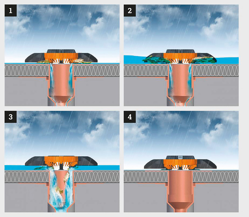 Der Roofguard von Fleck ist das innovative Laubsieb, das weder Laub, Hagel noch Starkregen scheut. Durch Starkregen und von Laub verstopfte Dachgullys können sich auf Flachdachflächen kritische Wassermengen anstauen. Im schlimmsten Fall kommt es zu Überflutungen. Das kann fatale Folgen haben, denn das angestaute Wasser kann in das Mauerwerk eindringen oder das Dach durch das Gewicht der Wassermassen zum Einsturz bringen. Der Roofguard reagiert auf gefährlich angestautes Wasser und beugt dem Schadensrisiko vor. Dank der patentierten Lifttechnik wird zu jeder Zeit ein sicherer Wasserablauf gewährleistet.