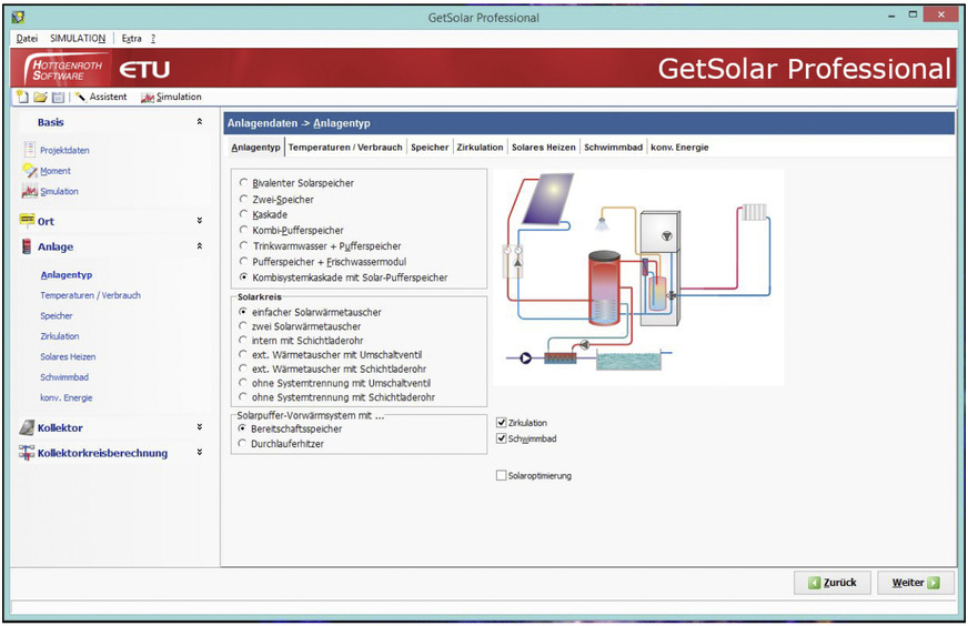 Thermische Solaranlagen kann man mittels Simulationssoftware dimensionieren. Dabei gilt es ein Optimum in Bezug auf Kollektorgröße und Pufferspeicher auszuwählen. Erfahrungswerte sind natürlich nützlich, reichen aber nicht immer aus um tatsächlich wirtschaftlich und effektiv zu entscheiden. Kostengünstige und umfangreiche Software zu diesem Thema wird von Hottgenroth angeboten. Getsolar Professional erlaubt bei sehr einfacher Einarbeitung in den Programmablauf die Optimierung vor dem eigentlichen Bau der Anlage.