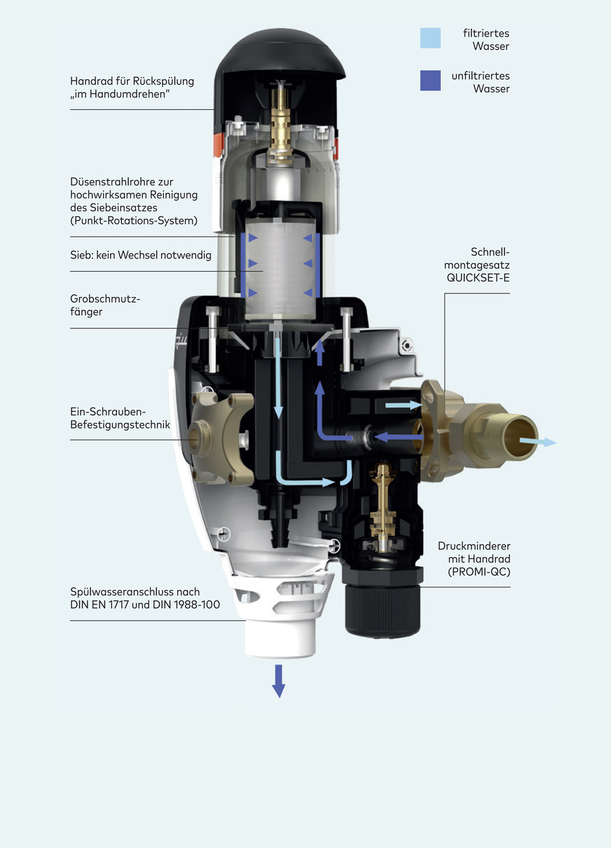 Der besondere Vorteil des rückspülbaren Filters besteht darin, dass der Siebeinsatz nicht getauscht muss. Dieser wird bei der Rückspülung gereinigt. Das geschieht mit dem sogenannten Punkt-Rotations-System. Dabei saugen mehrere Düsenstrahlrohre die Sieboberfläche Punkt für Punkt mit filtriertem Wasser ab. Gleichzeitig säubern sie das Schauglas. Die Schutzfilter und Hauswasserstationen sind auch in der Automatik-Version erhältlich. In dieser Ausführung läuft die Rückspülung automatisch ab, gesteuert zum Beispiel über Zeitintervalle und optional bei Schutzfiltern über den Verschmutzungsgrad.