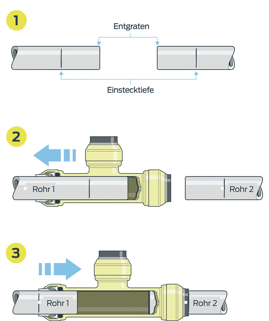 Die Verbindung lässt sich bei der Installation oder für Korrekturen mittels Lösezange oder einer ebenfalls erhältlichen Markier- und Lösehilfe jederzeit wieder lösen. Der Hersteller spricht für die Fittings aus DZR-Messing eine Garantie von 25 Jahren aus. Die T-Schiebeverbinder eignen sich für Rohrdurchmesser von 12 bis 28 mm und benötigen keine zusätzliche Erdung, da sie elektrisch durchgängig sind.