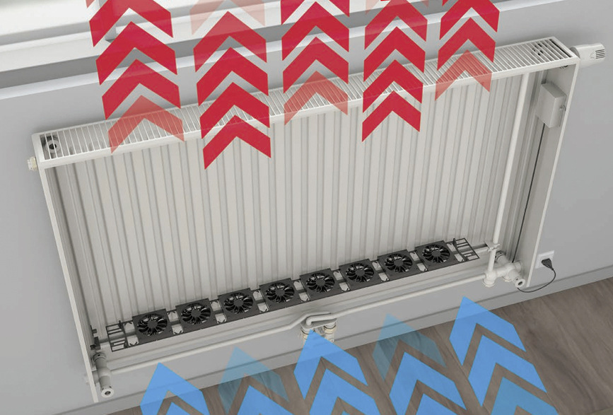 Die Serie X-AIR von E.C.A. punktet mit ausgezeichneten Wärmewerten, vor allem bei niedrigen Vorlauftemperaturen. Sie verfügt über mindestens acht Ventilatoren, die sich im unteren Teil des Heizkörpers befinden. Diese lassen sich für individuelle Wohlfühltemperaturen in vier Stufen zuzüglich Booster-Funktion einstellen. Per Stromanschluss werden das digitale Touchdisplay mit Automatikmodus und die Ventilatoren betrieben.