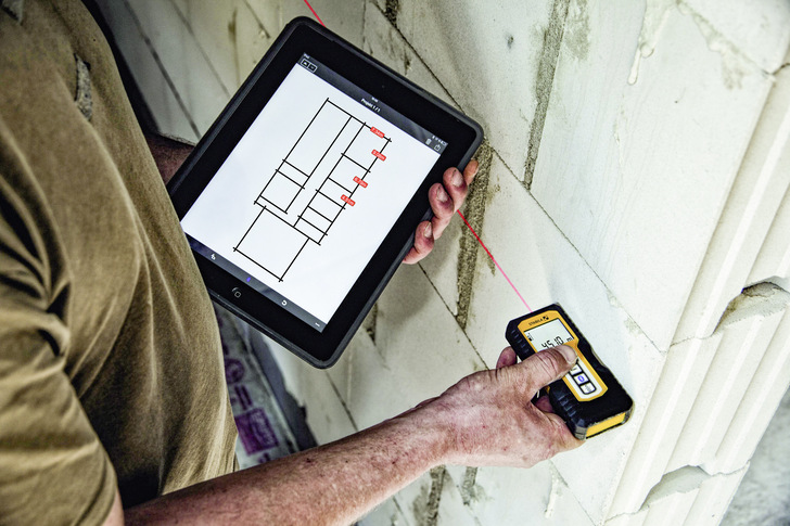 Vier Tasten reichen aus, um Länge, Fläche und Volumen zu ermitteln und so zum Beispiel den Materialbedarf zu bestimmen. Perfekt ergänzt wird diese Technologie durch das Übertragen auf ein Smartphone oder Tablet. Durch die kostenlose Aufmaß-App Stabila Measures werden die gemessenen Daten auf diese Weise weiterverarbeitet.