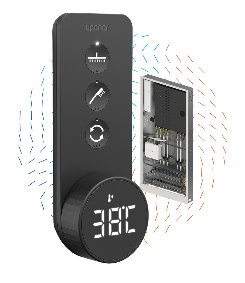 Durch die Verschiebung der elektrischen Duscharmatur in die Uponor Combi Port Wohnungsstation beschränkt sich mit I-Shower die Installation auf nur eine Leitung sowie das Kabel für die Fernbedienung pro Duschauslass. Die Kombination von I-Shower und Wohnungsstation führt zu einer energiesparenden und hygienischen dezentralen Warmwasserversorgung mit dem Duschkomfort elektronischer Mischer.