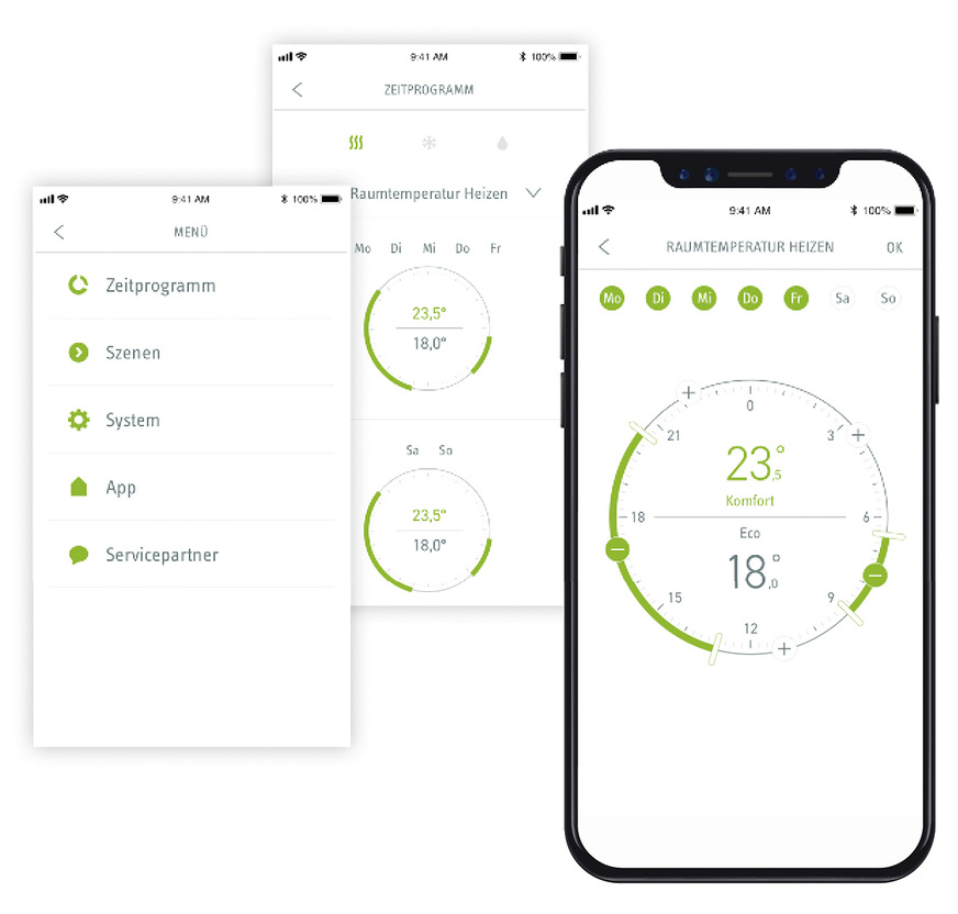 Gemütlich auf der Couch oder schnell bei nahendem Besuch lassen sich Heizungs- und Warmwassertemperatur flexibel und bequem wählen: Mit der App stellt man die gewünschte Raumtemperatur auf der übersichtlichen Bedienoberfläche im Smartphone ein. Auch die Warmwassertemperatur lässt sich so komfortabel steuern. Wer über den Moment hinaus planen möchte, kann entsprechende Zeitprogramme aufrufen, um beispielsweise Energie zu sparen, unterschiedliche Temperaturen zu unterschiedlichen Zeiten an Wochentagen und Wochenenden einzustellen oder einen Urlaubsmodus zu fahren. Verschiedene „Szenen“ bieten weiteren Komfort.