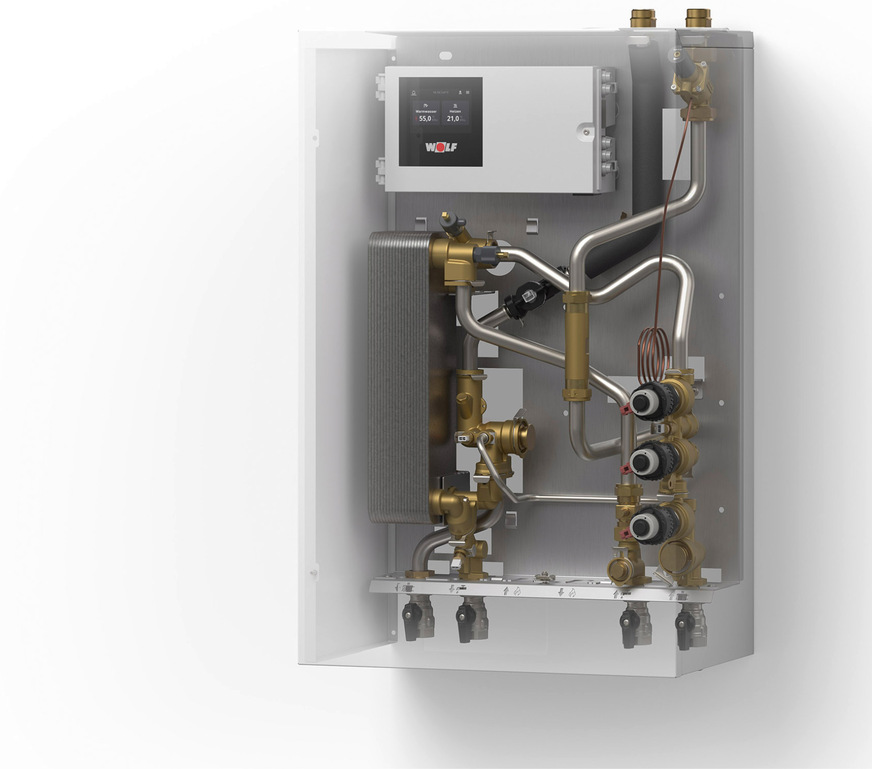 Mit dem Wolf CAT-2-Konfigurator ist auch die projektspezifische Planung schnell realisierbar. Die Station ist komplett voreingestellt und kann am Display angepasst werden. Hier wird auch das gesetzlich geforderte Wochenzeitprogramm eingerichtet und es unterstützt bei der Lösungsfindung im Fehlerfall. Darüber hinaus verfügt die Wohnungsstation über ein Estrich-Aufheizprogramm und kann witterungsgeführt betrieben werden.