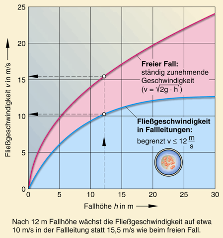Faktisch ist der Begriff „Fallleitung“ falsch. Früher, als dieser Leitungsteil benannt wurde, hat man angenommen, dass das Abwasser in dieser Leitung tatsächlich abstürzt. Deshalb nennt man diese Leitung ja auch „Fallleitung“. Die Fallleitungen in höheren Gebäuden wurden damals sogar mehrfach verzogen. Die fast waagerechten Leitungsstrecken sollten verhindern, dass Abwasser und Fäkalien zu schnell wurden und beim Aufprall die liegenden, weiterführenden Leitungen wohl möglich beschädigten. Bei einer Fallstrecke von zB. 25 Metern vermutete man eine „Fäkalienreisegeschwindigkeit“ von über 30 m/s beim Auftreffen auf die liegenden Anlagenteile. Richtig ist, dass die Geschwindigkeit des Abwassers in Fallleitungen erheblich ist. Die Annahme, dass diese mit zunehmender Fallhöhe immer größer wird, stimmt allerdings nicht. In der Fallleitung ist nämlich nicht nur Abwasser unterwegs, sondern auch Luft, die dem Druckausgleich dient.