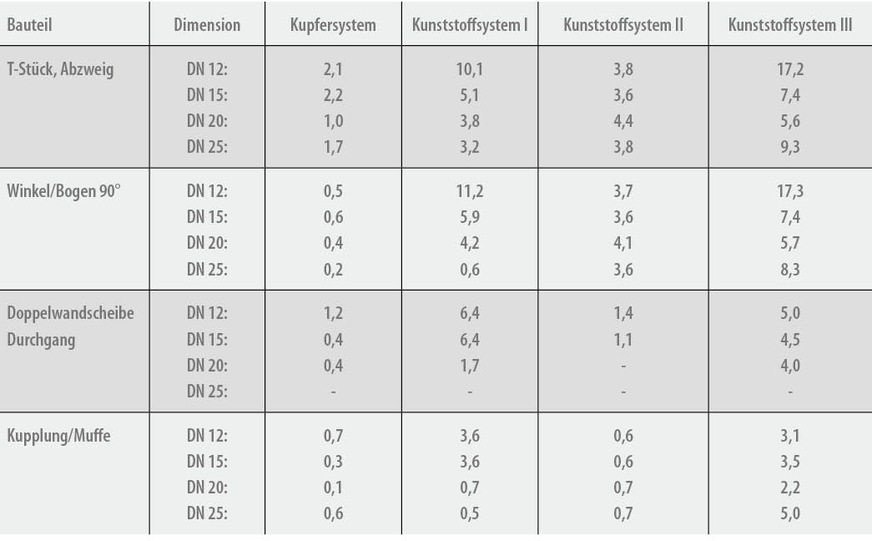 Es gilt also der planerische Grundsatz: Je knapper eine Trinkwasserinstallation dimensioniert ist (was ja auch gemäß DIN 1988-300 durchaus erwünscht und gewollt ist), desto bedeutender werden die Widerstandsbeiwerte aller Bauteile für die Auslegung! Wieviel das ausmachen kann, zeigen die individuellen Zeta-Werte diverser Bauteile aus verschiedenen Kunststoffrohrsystemen im Vergleich zu denen eines metallenen Rohrleitungssystems (hier: Kupfer):