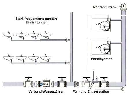 Der Löschwasserbedarf der Wandhydranten des Typs F (F = Benutzung durch die Feuerwehr) ist riesig. Ausgestattet mit einem formbeständigen Schlauch, benötigt jede Einheit mindestens 100 l/min bei einem Fließdruck von 3 bar. Ersetzt die Feuerwehr beim Einsatz diesen Schlauch gegen einen Textilschlauch, muss eine Wasserlieferung von sogar 500 l/min garantiert sein. Solche ernormen Wassermengen werden aber nur im Falle eines Brandes benötigt. In der brandschadenfreien Zeit pieselt durch die unvermeidbar großen Rohre dann nur das Rinnsälchen an Wasser, was die Teeküche nun mal so braucht. Und damit stehen sich ein Volumenstrom von 0,07 l/s und 8,3 l/s gegenüber, wenn an der Leitung nur ein einziger Wandhydrant angeschlossen ist. Sind drei oder mehr Wandhydranten an der „Teeküchenleitung“ angeschlossen, dann stehen den 0,07 l/s immerhin schon 25 l/s (für den gleichzeitigen Betrieb von drei Wandhydranten) gegenüber. Dass die Teeküchen-Armatur hier nicht für einen hygienisch tatsächlich ausreichenden Wasseraustausch sorgen kann, bedarf wohl keiner Erläuterung.