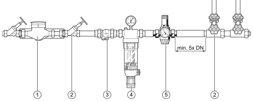 Eine Beruhigungsstrecke von 5 x DN ist gekennzeichnet