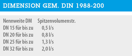 Um die Regeleigenschaften gemäß den Anforderungen in vernünftigen Grenzen zu erhalten, sollte die Größe des DM sinnvoll ausgewählt werden. Es gilt nicht, wie gerne angenommen wird: An ein zölliges Rohr gehört auch ein zölliger Druckminderer. Kriterium ist dabei innerhalb eines herkömmlichen Trinkwassersystems der Spitzendurchfluss. Die zu erwartenden Volumenströme sollten also in einem gesunden Regelbereich des DM liegen. Bei winzigen Entnahmen (Schnapsglas füllen innerhalb von zwei Minuten) akzeptiert man dann die Regelabweichung ebenso wie beim Überschreiten (Füllen des Pools zum Sommeranfang). Aber die Standardentnahme, beispielsweise am Waschtisch, wird dann wunderbar und ohne merkbare Schwankungen glattgebügelt.