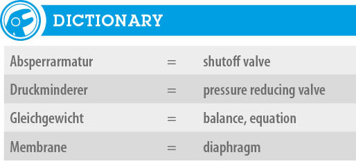 Für ein Trinkwassersystem ist es oft ausreichend, genau mit der Einheit „Bar“ umzugehen und eine Stelle nach dem Komma mitzuziehen. Man liest also häufig einen Druck in Fließrichtung vor dem Druckminderer, daher Vordruck genannt, von vielleicht 10 bar ab. Allerdings nur in Ruhe. Wird an einem Verbraucher Wasser entnommen, fällt der Druck ab. Diesen Druck bezeichnet man als Fließdruck. Innerhalb des Druckminderers sorgen eine Anzahl von Bauelementen für eine Druckreduzierung auf den gewünschten Ausgangsdruck. Dieser wird auch als Hinterdruck bezeichnet. Geregelt wird oft auf einen Druck von 4,0 bis 4,5 bar. Dieser Druck reicht häufig aus, um die gängigen Komponenten einer Installation sicher und komfortabel zu betreiben. Zwei Faktoren machen den Vorgang des Druckminderns nun recht kompliziert. Zum einen beträgt der Vordruck im Trinkwassernetz des Versorgers nicht ganztägig 10 bar, sondern geht in Zeiten von Spitzenabnahmen in dem jeweiligen Stadtviertel auch mal runter auf vielleicht nur 4 bar. Zum anderen wird auf der Verbraucherseite nicht immer nur das Kaffeetässchen ausgespült, sondern auch mal die Schwallbrause im Bad gleichzeitig betrieben. Auf beide alltäglichen „Störfälle“ muss der Druckminderer in angemessener Zeit reagieren. Das wäre selbst für einen Redakteur der SBZ eine große Aufgabe. Wie aber bekannt ist, funktioniert es prächtig.