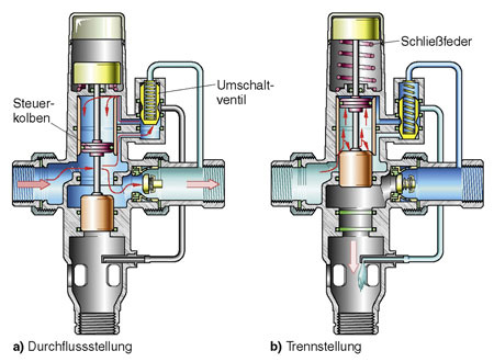 Rohrtrenner GB sind Sicherungsarmaturen, die nur dann in Durchfluss-Stellung schalten, wenn Wasser benötigt wird. Sinkt während einer Wasserentnahme der Wasserdruck auf einen bestimmten Wert ab, schaltet die Armatur in Trennstellung. So wird ein Rückfließen oder gar Rücksaugen von Nichttrinkwasser sicher verhindert. Die Überprüfung der Armatur muss der Betreiber halbjährlich durchführen. Dazu schließt man während einer Wasserentnahme eine dem Rohrtrenner vorgeschaltete Absperrarmatur. Der Rohrtrenner muss in Trennstellung schalten. Bei Wiederherstellung der Ausgangsbedingungen muss dieser bei Wasserbedarf die Durchflussstellung einnehmen und dicht schließen. Nach Beendigung der Wasserentnahme muss er in die Trennstellung zurückschalten.