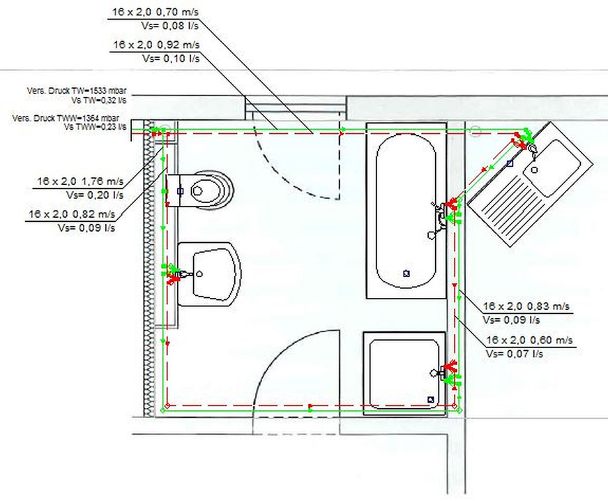 Die Parallelschaltung von Widerständen im Rohrnetz und die Aufteilung des Volumenstroms auf zwei Fließwege führen zu einer Druckverlust- und Hygieneoptimierung und zur Minimierung des Rohrinhaltes der Installation. Der Warmwasserinhalt liegt insgesamt deutlich unter 3 l. Damit kann mit dieser Installationsart bei der hier gezeigten Vollausstattung ein Einschleifen der Zirkulationsleitung vermieden werden.