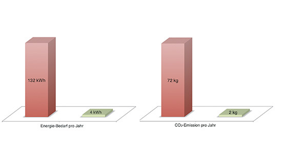 Im gleichen Maße sinkt die CO2-Emission. Es ist bekannt, dass konventionell erzeugte Elektrizität hohe Primärenergieverluste aufweist, wenn sie aus fossilen Brennstoffen wie Gas und Kohle in Kraftwerken durch wärme- bzw. dampfgetriebene Turbinen erzeugt wird. Es entstehen in diesen Kraftwerken hohe Verluste durch Abwärme, die bekanntermaßen Atmosphäre und Flüsse belasten. Eine weitere Belastung stellt natürlich der CO2-Ausstoß durch den Verbrennungsprozess dar. Weniger Stromverbrauch ist also auch mehr Umweltschutz.