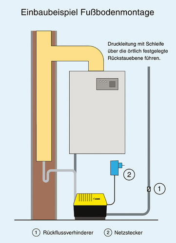 Der Einbau von Kondensatpumpen ist denkbar einfach. Gute Modelle werden einbaufertig angeboten und zeichnen sich durch niedrige Geräuschemissionen aus. Dies ist besonders dann wichtig, wenn die Heizgeräte und damit auch die Kondensatpumpe im unmittelbaren Wohnumfeld untergebracht sind, z. B. bei dezentraler Beheizung im Mehrfamilienhaus. Sowohl wandhängende als auch bodenstehende Montage ist bei der „K1” von Jung Pumpen möglich. Eine ausreichend lange Netzleitung, 6m beständiger Druckschlauch sowie der Rückflussverhinderer gehören zum Lieferumfang. Serienmäßig verfügt die Anlage über einen integrierten Alarmkontaktgeber, an den z.B. eine steckerfertige Alarmanlage aus dem Zubehörprogramm angeschlossen werden kann. Dabei verhindert ein spezieller Überlaufstutzen am Behälter der „K1”, dass Bauteile der Kondensatpumpe bei einem Ausfall Schaden nehmen. Der Anschluss der Alarmanlage an den Heizkessel sollte genau abgewogen werden. Denn mitunter verursacht ein Abschalten des Heizkessels einen höheren Schaden als ein überlaufender Kondensatbehälter – gerade bei älteren Gebäuden mit bedenklichem Leitungsverlauf oder unzureichender Dämmung sollte dies berücksichtigt werden. Bei Installation einer Kondensatpumpe unterhalb der Rückstauebene muss für eine sachgerechte Rückstausicherung gesorgt werden, das heißt, die Druckleitung muss mit einer Schleife über die Rückstauebene geführt werden.