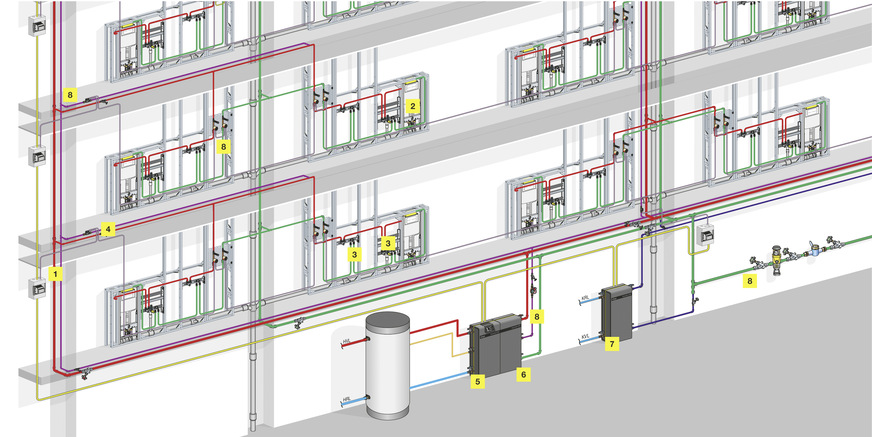 Über einen neu konstruierten Durchflusstrinkwassererwärmer (DTE) wird beispielsweise die Menge des vorzuhaltenden erwärmten Trinkwassers reduziert. Elektronisch gesteuerte Regulierventile sorgen wiederum für eine hygienegerechte Temperaturhaltung in der Trinkwasserverteilung. Automatisch auslösende Spülstationen, Spülkästen und Auslaufarmaturen sichern den bestimmungsgemäßen Betrieb der Trinkwasseranlage. Kommt es in den Leitungen für kaltes Trinkwasser zu einem hygienekritischen Temperaturanstieg, wird zudem auch dieser Volumenstrom entsprechend behandelt. Dazu wird dieser über einen ebenfalls neu entwickelten Durchflusstrinkwasserkühler (DTK) geführt.