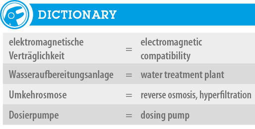 Die Wasseraufbereitungstechnik kommt im Prüfstandbereich von Motoren zum Einsatz. Hier gilt der EMV-Integrationsleitfaden. Die elektromagnetische Verträglichkeit, kurz EMV, bezeichnet die Fähigkeit von elektrotechnischen Geräten, zu funktionieren, ohne andere Einrichtungen zu stören oder selbst gestört zu werden. Damit dies gewährleistet werden kann, müssen alle Anlagen diesem Standard entsprechen.