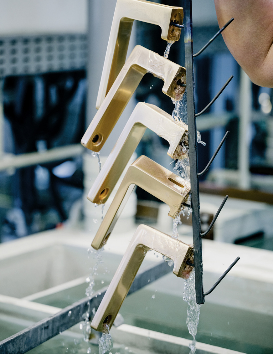 Der Prozess, den eine ReCrafted-Armatur von Dornbracht durchläuft, ist geprägt durch handwerkliches Arbeiten und die Expertise der Fachkräfte am Standort in Iserlohn. Vom Demontieren über das Schleifen und Neu-Veredeln bis hin zum Verpacken – jeder einzelne Schritt dient der Werterhaltung.