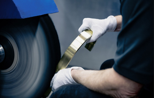 Anschließend wird die Oberfläche in Handarbeit aufbereitet: Beim Schleifen werden Unebenheiten auf der Oberfläche des Werkstücks entfernt. Beim Führen der Schleifbänder mit Kontaktscheiben bedarf es einer perfekten Kombination aus Anpressdruck und Schnittgeschwindigkeit.