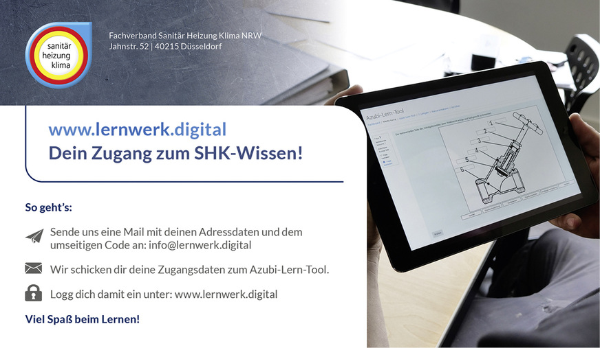 Ab 50 Lizenzen freut sich der Fachverband den SHK-Innungen in NRW Staffelpreise anbieten zu können. Denn das Azubi-Lern-Tool ist nicht nur ein Helferlein für Unternehmer*innen. Auch Innungen und Berufsschullehrer*innen haben bereits Interesse am übergreifenden Einsatz des digitalen Lern-Tools gezeigt. So ist derzeit eine vernetzte Variante in Planung: Ein „Azubi-Prüf-Tool“, das sich speziell an Lehrende im SHK-Handwerk richtet.
