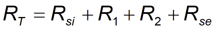 Der gesamte Widerstand ergibt sich also aus einem Übergangswiderstand innen (Rsi) dem Widerstand des Stahls (R1) dem der Dämmung (R2) und dem äußeren Übergangswiderstand (Rse)