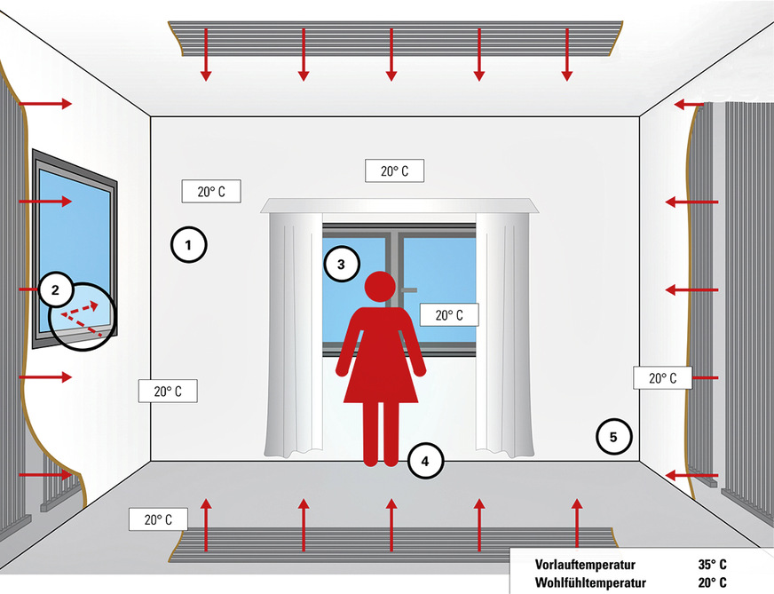 Die aus dem korrosionsresistenten Kunststoff Polypropylen gefertigten Register erwärmen nicht die Luft, sondern die Objekte, den Boden, die Wände, die Möbel – alles, was sich in den Räumen befindet. Dazu wird das System in die Decke verlegt und erwärmt diese sanft auf Oberflächentemperaturen von bis zu 26 °C. Die Energie wird nun als Wärmestrahlung in den Raum abgegeben. Dort, wo die Wärmestrahlung auf Gegenstände trifft, werden diese erwärmt. Die gemessene Lufttemperatur kann bei dieser Art von Beheizung aufgrund der gleichmäßigen Wärmestrahlung der Raumumfassungsflächen ca. 3°C niedriger liegen als bei Konvektionsheizungen – das Thermometer zeigt 20 °C und es fühlt sich an wie 23 °C. Dies fördert das Wohlbefinden und spart auch noch rund 18 % Energie.