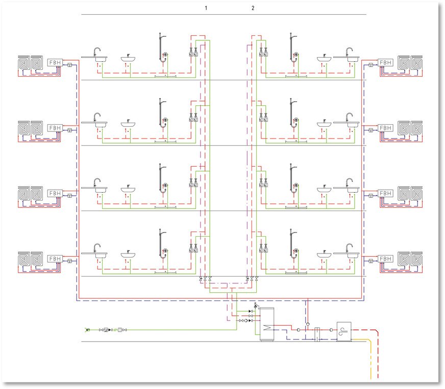 Jedes moderne Gebäude, ähnlich dem in Meerbusch, das über die gültigen Dämmstandards verfügt, kann derzeit mit Heizenergie über eine Wärmepumpe versorgt werden. Aktueller Standard ist, hierfür fast immer eine zentrale Anlage aufzubauen. Ausgehend von dieser Zentrale wird erwärmtes Wasser an die Wohnungen verteilt. Das gilt für Heizungswasser und für Trinkwarmwasser gleichermaßen.