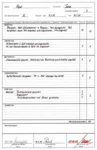 Pflicht ist, die in einer Ausbildungswoche ausgeführten Tätigkeiten zu Papier zu bringen. Mit dieser Auflistung soll sichergestellt werden, dass der Azubi auch tatsächlich in den Genuss der praktischen Arbeiten kommt, die der Betrieb zu vermitteln hat. Um Aufschluss darüber zu erhalten, wie weit die Vermittlung der praktischen Fertigkeiten in die Tiefe gegangen ist, soll der Ausbilder von seinem Azubi auch das Anfertigen von Zeichnungen und Tätigkeitsbeschreibungen verlangen. Dafür muss der Auszubildende einen Arbeitsablauf noch einmal Revue passieren lassen, was dabei hilft, diesen besser zu verstehen. Die Führung des Berichtsheftes stellt also einen Teil der praktischen Ausbildung dar. Deshalb muss dem Azubi die Gelegenheit gegeben sein, sein Berichtsheft während der Arbeitszeit im Betrieb zu bearbeiten. In der Praxis erledigen viele Auszubildende dies jedoch freiwillig zu Hause, da lieber in gewohnter Umgebung und mit gewohnten Hilfsmitteln (ev. PC) gearbeitet wird (und einem der Boss nicht so auf die Pelle rücken kann).