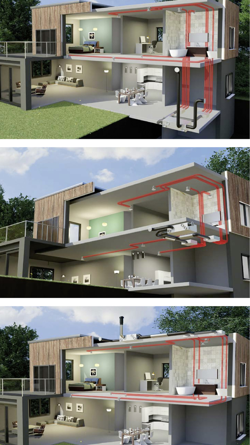 Zentrale Lüftungs-Systeme erhöhen die Luftqualität in jedem Gebäude durch permanenten Luftaustausch und Filtration erheblich und sparen Energie durch die Wärmerückgewinnung. Über die wärmegedämmte Außenluftansaugung wird frische Luft in das System hinein transportiert. Im Wärmetauscher des Lüftungsgerätes wird der beispielsweise aus Küche, Bad, Dusche oder WC abgesaugten, verbrauchten und belasteten Luft die Wärme entzogen. Anschließend wird diese an die Frischluft abgegeben (bis > 90% Wärmerückgewinnung). Beide Luftströme sind bei der Wärmeabgabe und -übernahme völlig voneinander getrennt und werden vor dem Durchströmen des Wärmetauschers gefiltert. Die Abluft wird anschließend ins Freie geleitet. Die vorgewärmte, fein gefilterte Frischluft gelangt über ein Luftverteilsystem zu den einzelnen Räumen und wird über Zuluftventile bedarfsgerecht und zugfrei in die Innenräume geleitet. Abluftventile transportieren parallel dazu verbrauchte Luft nach draußen.