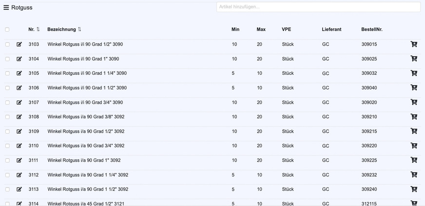 In der Artikelliste definiert man das Material, das im Lager bewirtschaftet werden soll. Je umfangreicher die Liste wird, desto mehr profitiert der Betrieb davon, da die Prozesskosten für die Bestellung des Standardmaterials niedriger sind als die für Kommissionsmaterial. Denn das Ziel ist es, Standardmaterial nur einmal die Woche zu bestellen und das Material immer im Lager verfügbar zu haben. Das reduziert den Verwaltungsaufwand und die Beschaffungsfahrten.