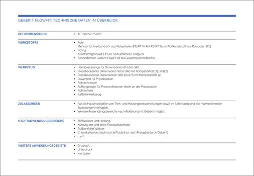 Geberit FlowFit ist in den Dimensionen d16 bis d75 erhältlich. Mehrschichtverbundrohre bis d20 lassen sich mit Hilfe von Biegefedern biegen, für die Dimensionen ab d25 bis d50 wird ein Biegewerkzeug benötigt. Die Rohre stehen in mehreren Varianten zur Verfügung: FlowFit ist als Mehrschichtverbundrohr als Stangen- oder Rollenware erhältlich und kann wahlweise als Rolle nackt, Schutzrohr oder vorgedämmt ausgewählt werden. Darüber hinaus gibt es FlowFit auch als Vollkunststoffrohr. Für den Einsatz in geschlossenen Kreisläufen (z.B. im Heizungsbereich) ist ebenfalls ein Mehrschichtverbundrohr als Stangen- oder Rollenware, sowie je nach Bedarf vorgedämmt und exzentrisch verfügbar. Dank dieser Variantenvielfalt und einer Auswahl von mehr als 450 Fittings aus Polyphenylensulfon (PPSU) sowie Gewindeteilen aus bleifreiem Rotguss und bleifreier Siliziumbronze lässt sich so gut wie jede Sanitärinstallation in der Haustechnik lösen. Geberit FlowFit ist für die Heizungsinstallation von 0 bis 80 Grad, für die Trinkwasserinstallation von 0 bis 70 Grad sowie für einen Betriebsdruck bis zu 1 MPa (10 bar) zugelassen. Das neue System erfüllt die zu erwartenden strengeren Vorgaben der europäischen Chemikalienverordnung REACH 2021. Zudem verfügt FlowFit über das DVGW Baumusterprüfzertifikat DW-8801DK0200.